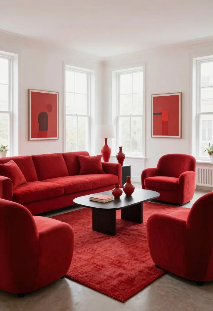 This technique works best in well-lit rooms where the richness of red won’t overwhelm. Mixing textures, like a plush red sofa with a flat-woven rug, adds depth and visual interest.