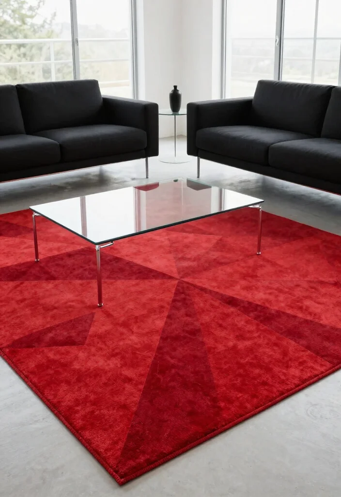 A red rug adorned with geometric shapes can become the highlight of a minimalist room, breaking the monotony of solid colors. Pair it with sleek furniture to maintain a modern aesthetic without overwhelming the area.