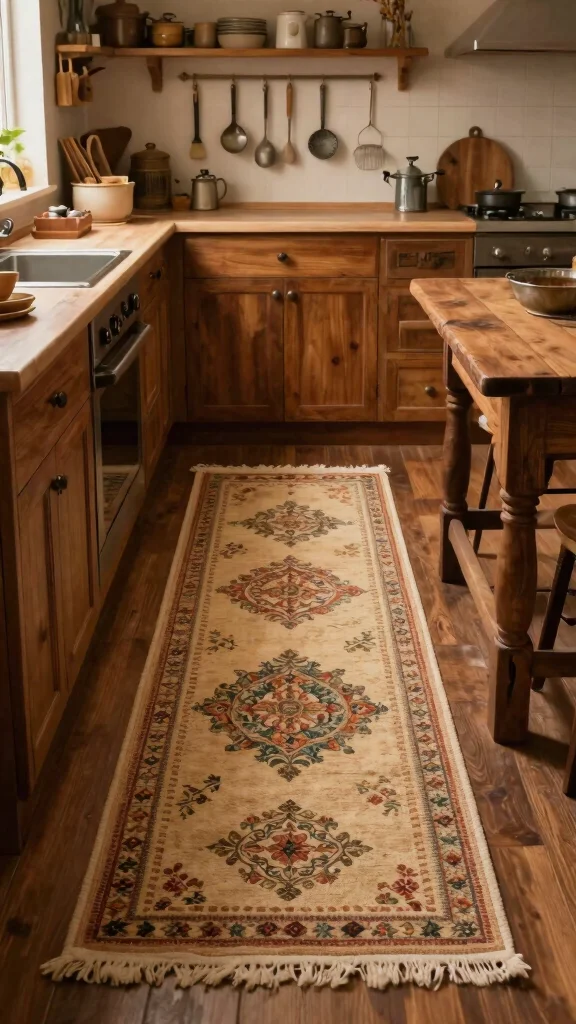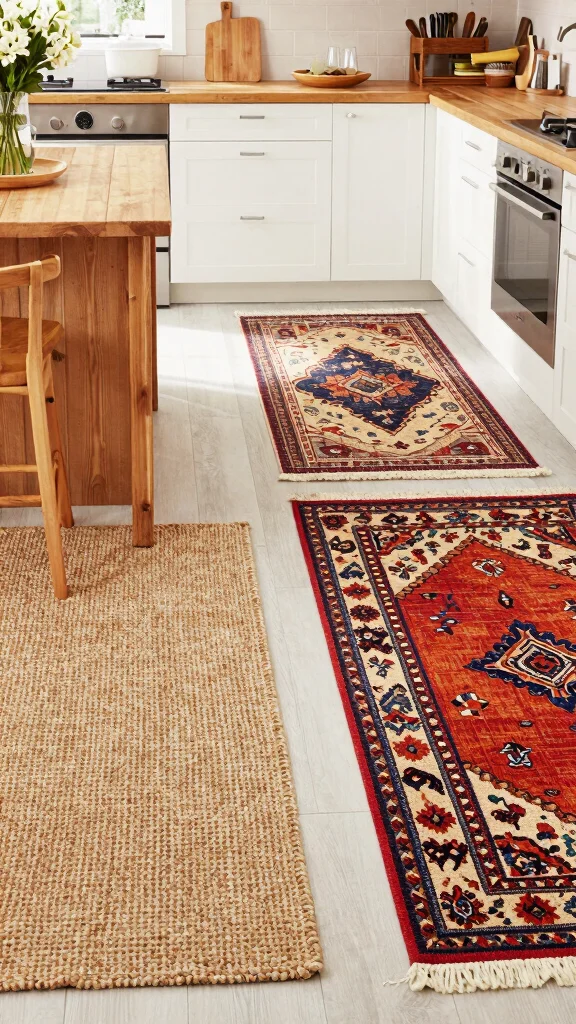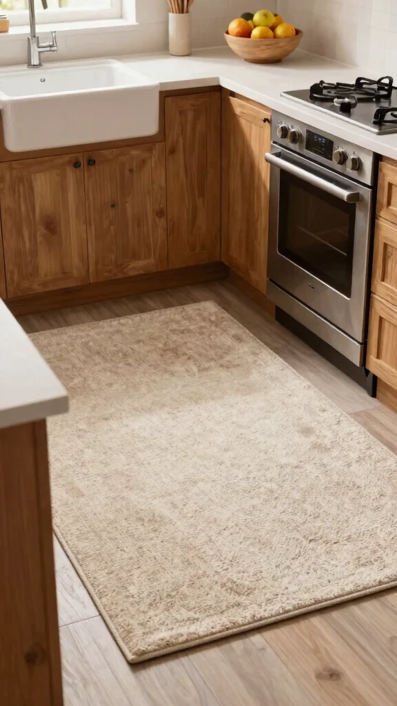 Choose rugs that balance protection and practicality: look for practical kitchen flooring with low-pile fibers that resist crumbs and spills.