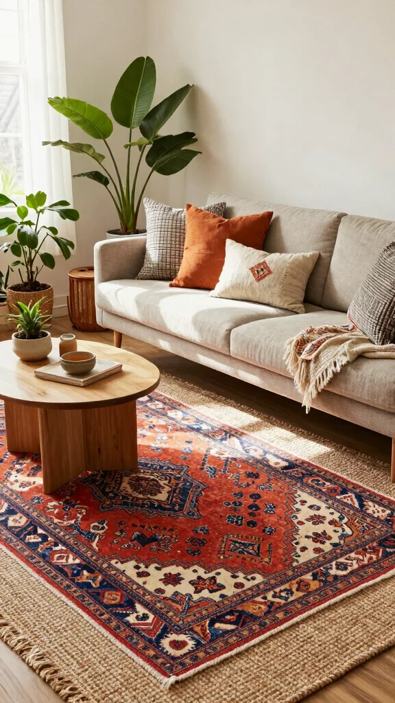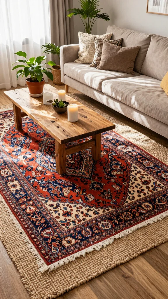 Fun fact: Layering rugs can boost perceived coziness by up to 40% in living rooms. Mix a large jute base with a smaller patterned rug to add depth and color, making your rugs in living room ideas feel instantly welcoming.