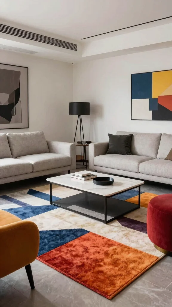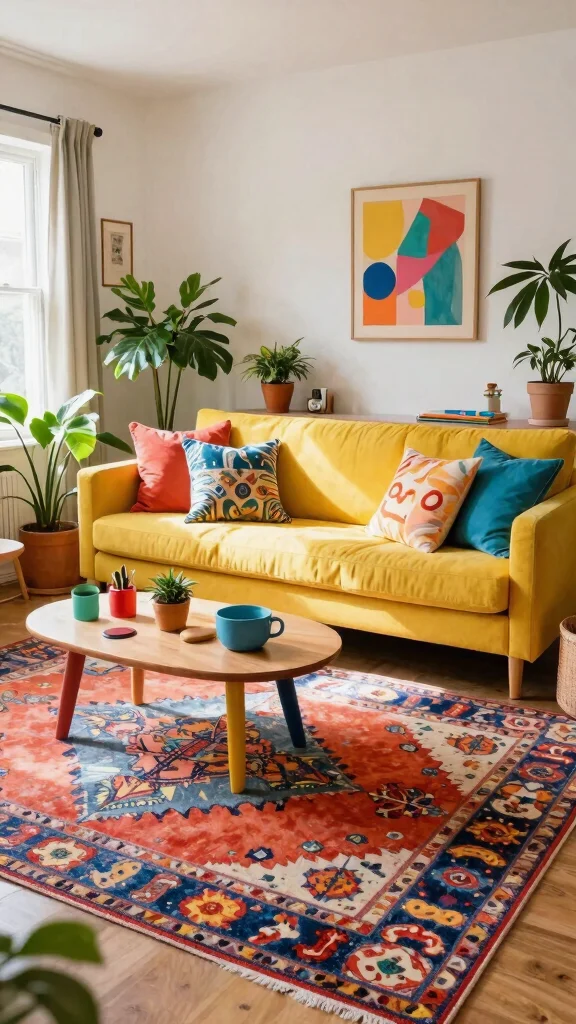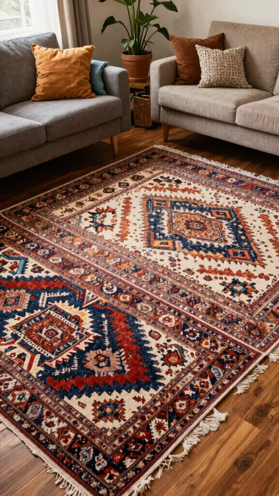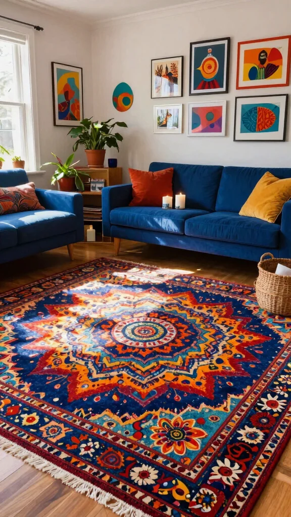 – Balance vibrant rugs with neutral furniture elements.