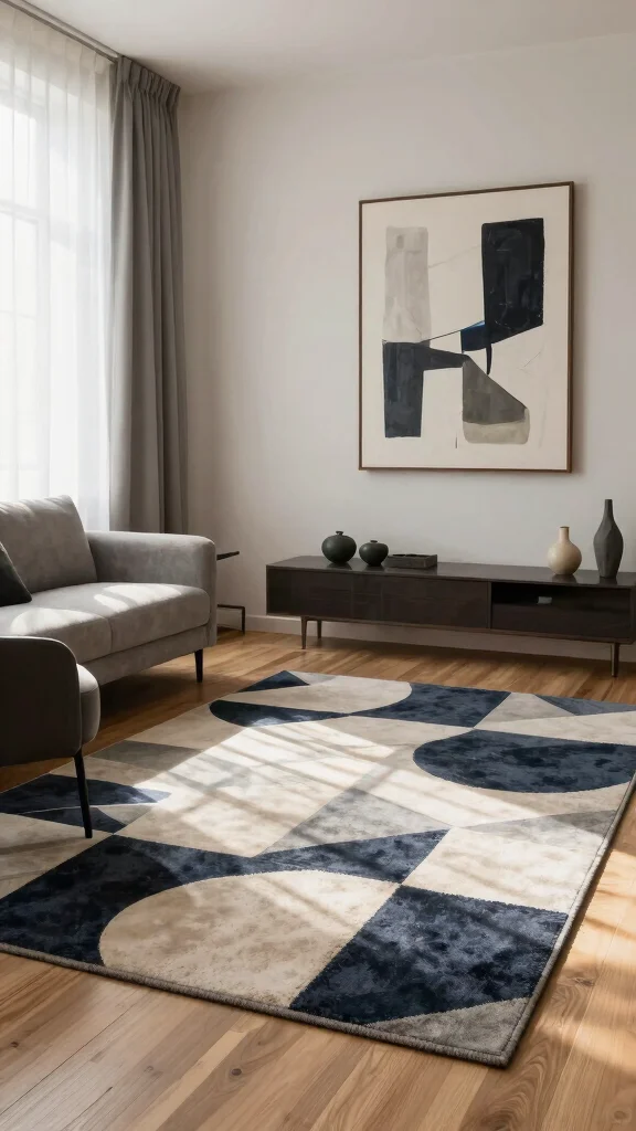 – Pair geometric rugs with solid furniture for a balanced look.