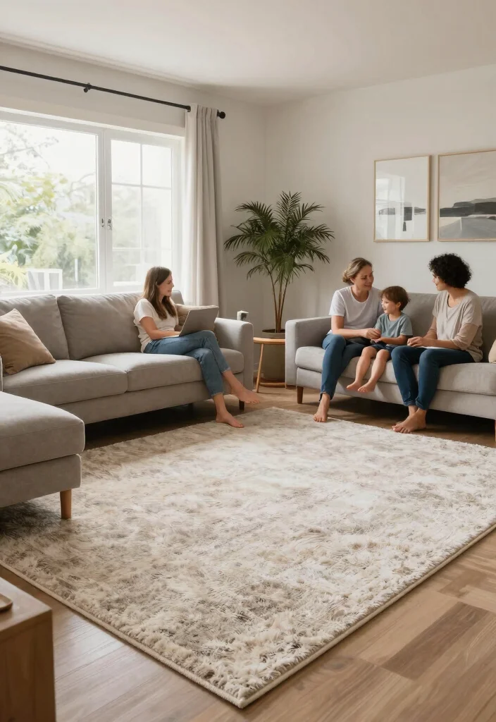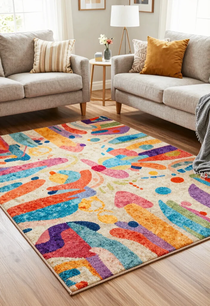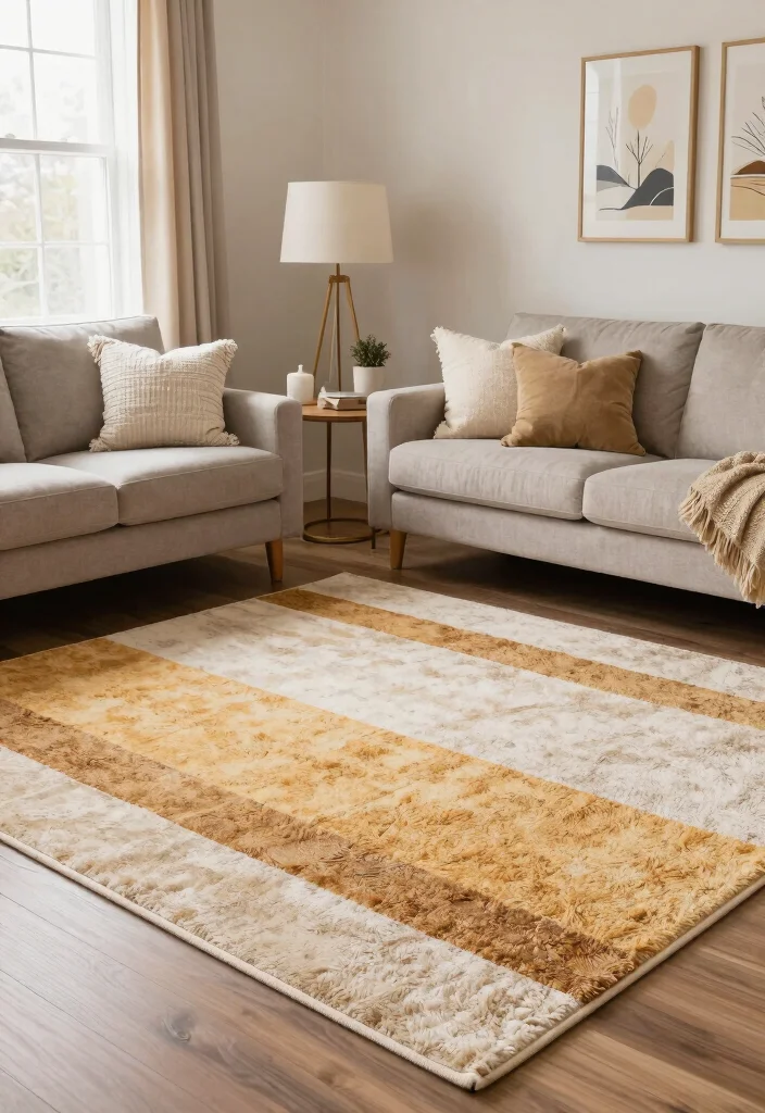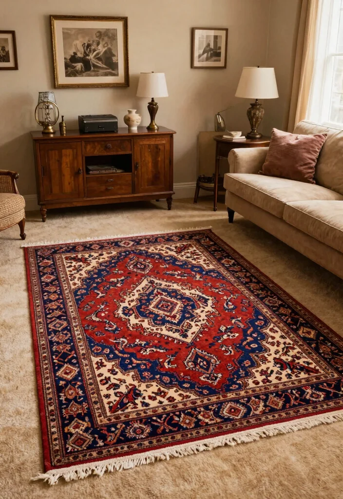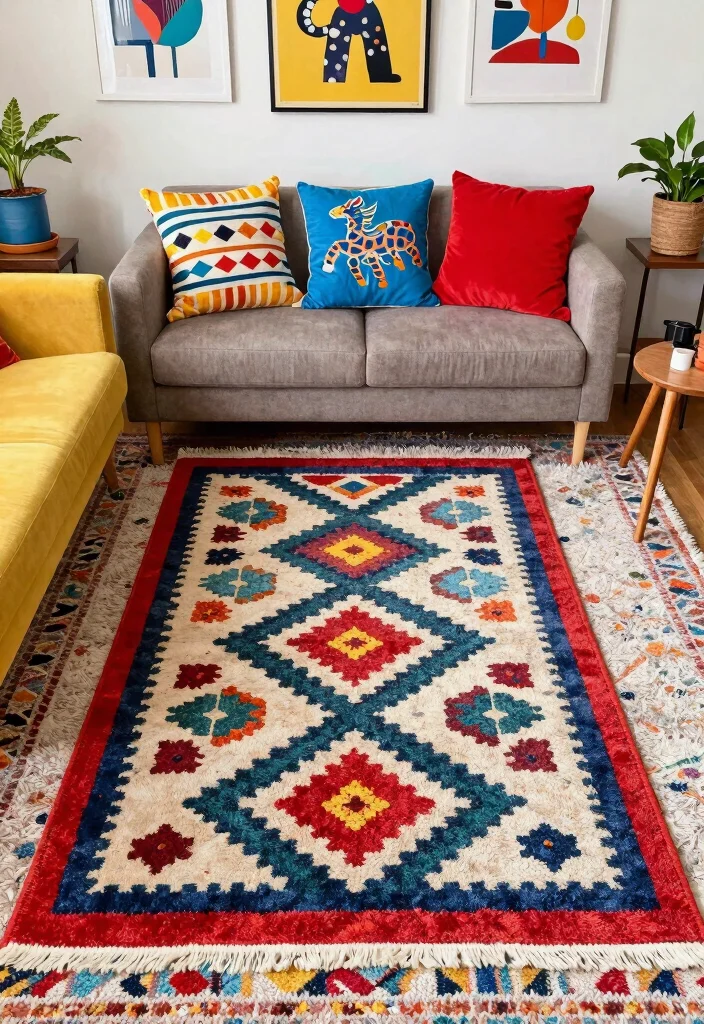 Fun fact: rugs on carpet with contrasting colors create instant zones, and the eye perceives space up to 20% larger. Pair a deep navy or emerald rug with a soft beige carpet to anchor furniture and boost cozy vibes!