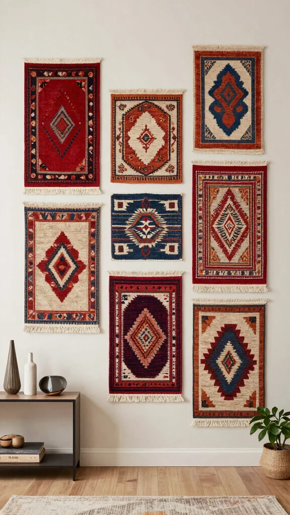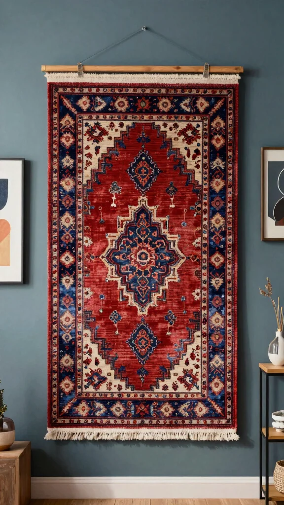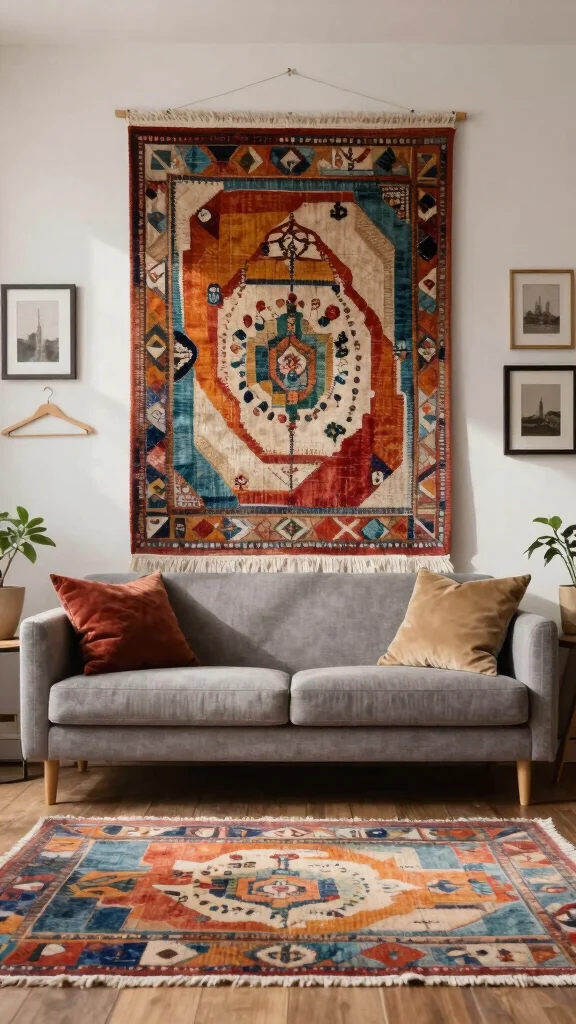 Selecting a large, vibrant rug to hang above your sofa or bed creates a stunning focal point that instantly enhances your decor. The striking colors and intricate patterns can transform a room, adding warmth and personality. Think about a rich red or deep blue rug with unique shapes that draws the eye and sparks conversation.