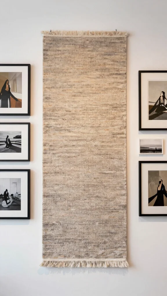 To maximize this idea, pay attention to the rug’s size and texture. A plush, thick rug adds depth, while a flat-weave option provides a sleeker look. Combine it with smaller artworks or framed photos to curate a gallery feel, and use decorative hangers for an elegant presentation.