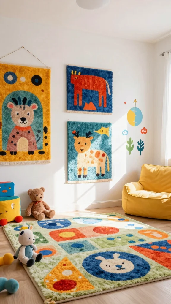 Transform your child’s play area by hanging playful rugs on the walls to create a vibrant and inviting atmosphere. Opt for designs featuring whimsical animals or bright landscapes that spark imagination and creativity. This not only adds color but also provides a soft environment for children to play safely.
