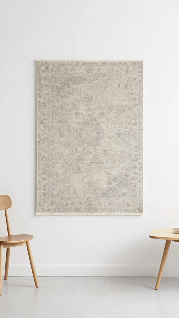 With rugs on wall, less is more—start with a single, understated rug on a clean white wall. Let its texture shine and pair it with minimal furniture to keep space airy. Practical tip: keep patterns subtle and colors muted to maintain elegance.