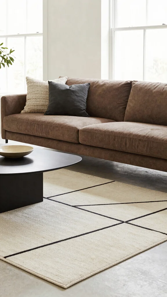 For those who appreciate simplicity, a minimalist geometric rug can perfectly complement your brown couch. Featuring clean lines and basic shapes, these rugs are ideal for modern and contemporary spaces. The straightforward patterns create a calm atmosphere, allowing your brown couch to shine as the focal point of the room.