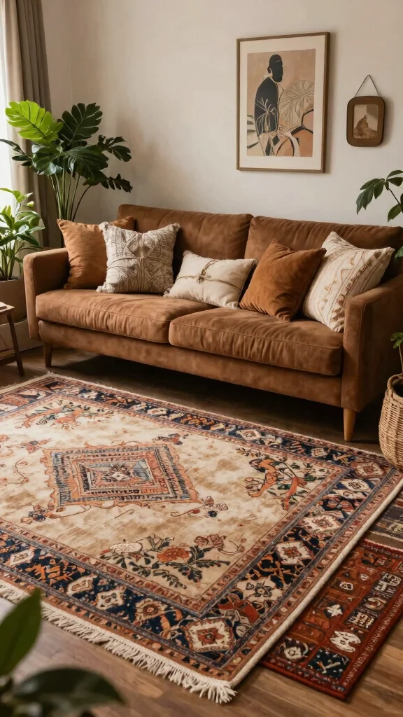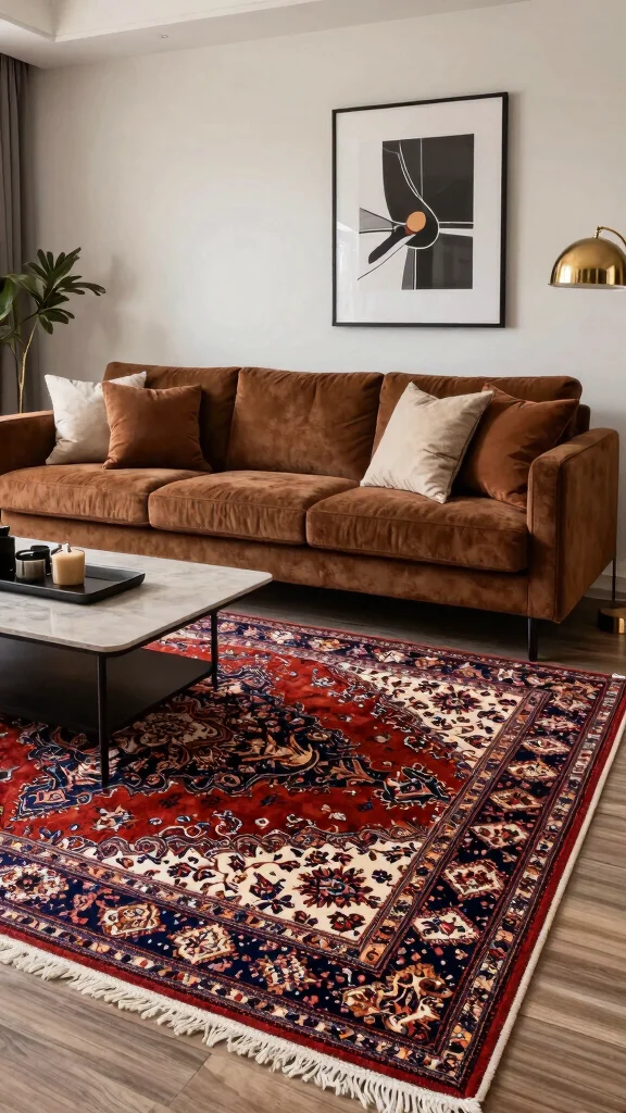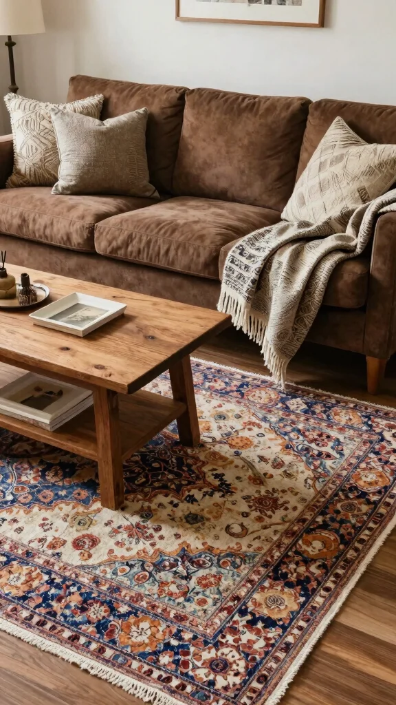 Vintage rugs add a distinctive charm and history to your decor. Often showcasing faded colors and intricate designs, they can beautifully enhance a brown couch while creating a cozy atmosphere. Each vintage piece tells a story, infusing your living area with character and warmth.