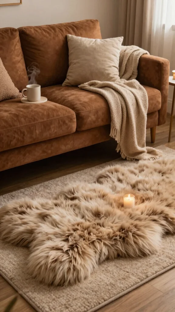 Indulge yourself in comfort with a soft faux fur rug beneath your feet. This option is perfect for creating a warm and inviting atmosphere in your living room, harmonizing beautifully with a brown couch. The plush texture feels delightful while adding a layer of sophistication that balances the couch’s rugged quality. Picture curling up with a book in a cozy nook adorned with a faux fur rug.