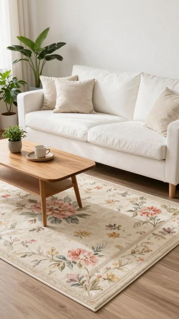 Fun fact: Rugs with white couch setups create a calmer, brighter living space—studies show rooms feel up to 20% larger with muted floral patterns. Pair soft pastels with cushions in the rug’s tones, and add greenery for a fresh, inviting vibe.