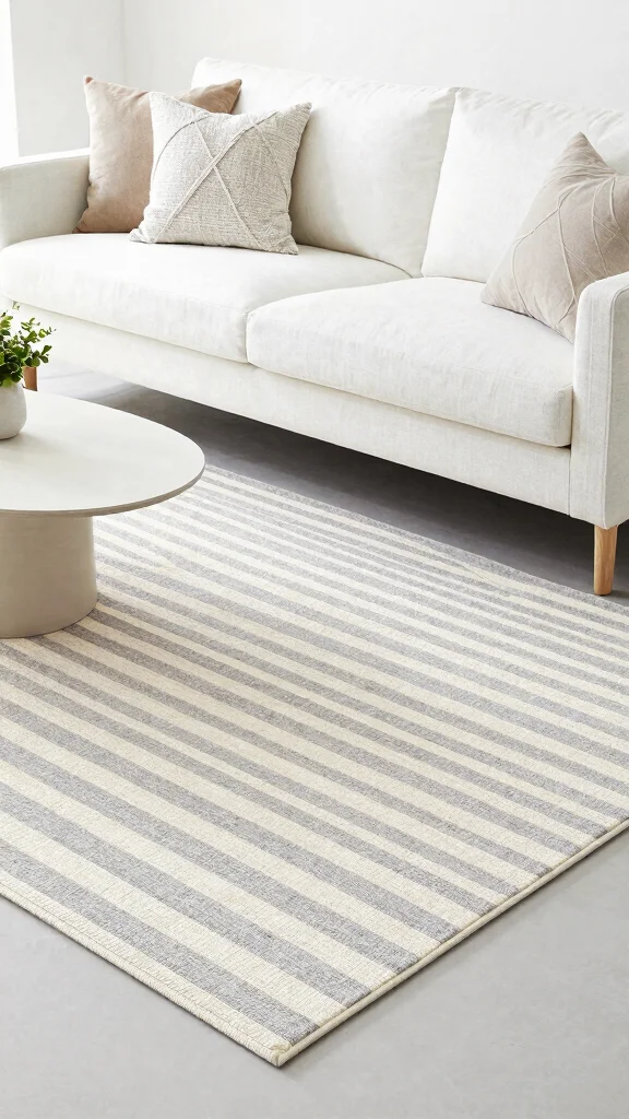 A striped area rug grounds rugs with white couch, delivering a fresh, calming contrast. Pair it with minimal furnishings and varied textures on the sofa to add depth. A few subtle pillows finish the look for chic cohesion.