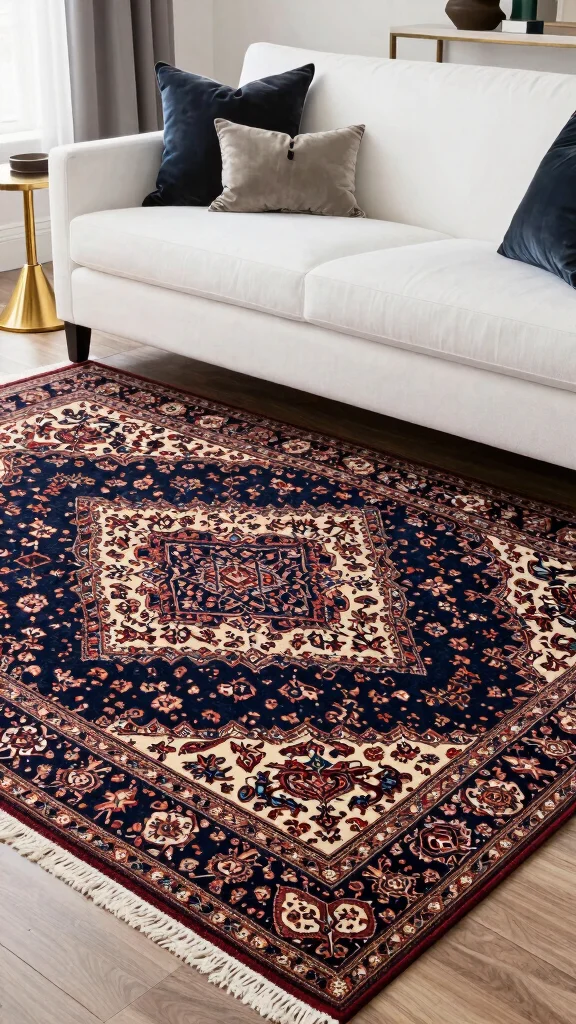 A vintage Persian-inspired rug can add a touch of elegance and history to your living room, beautifully contrasting with a simple white couch.