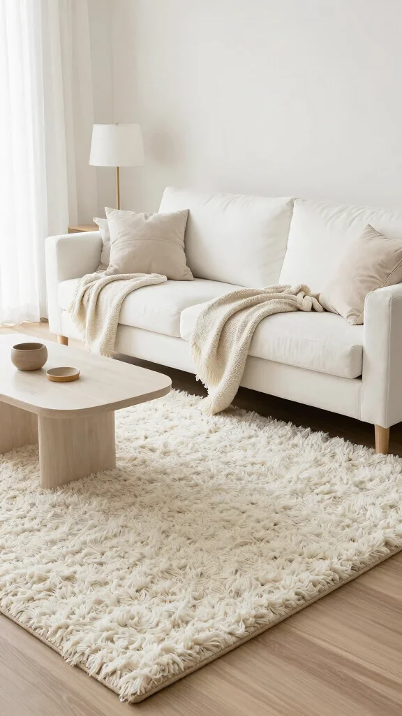 Fun fact: In Scandinavian-inspired spaces, a luxury shag rug under rugs with white couch adds instant coziness without overpowering the light palette. Keeping it in creams or off-whites helps the room feel airy, clean, and inviting.