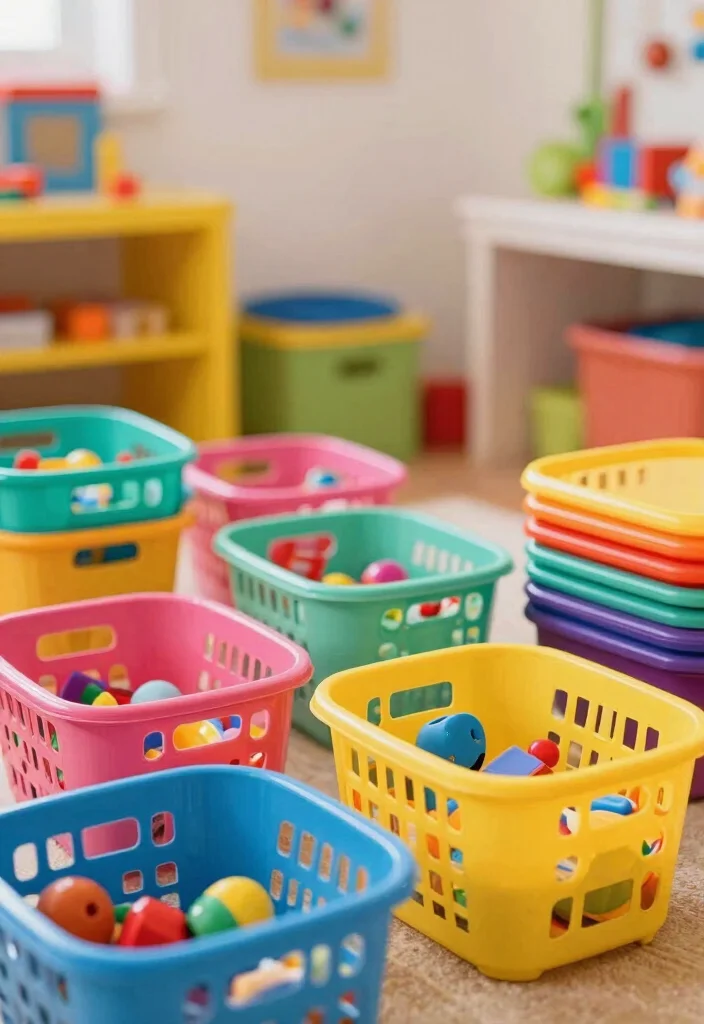 Incorporate colorful plastic baskets to brighten up your space while keeping things organized and easy to access.