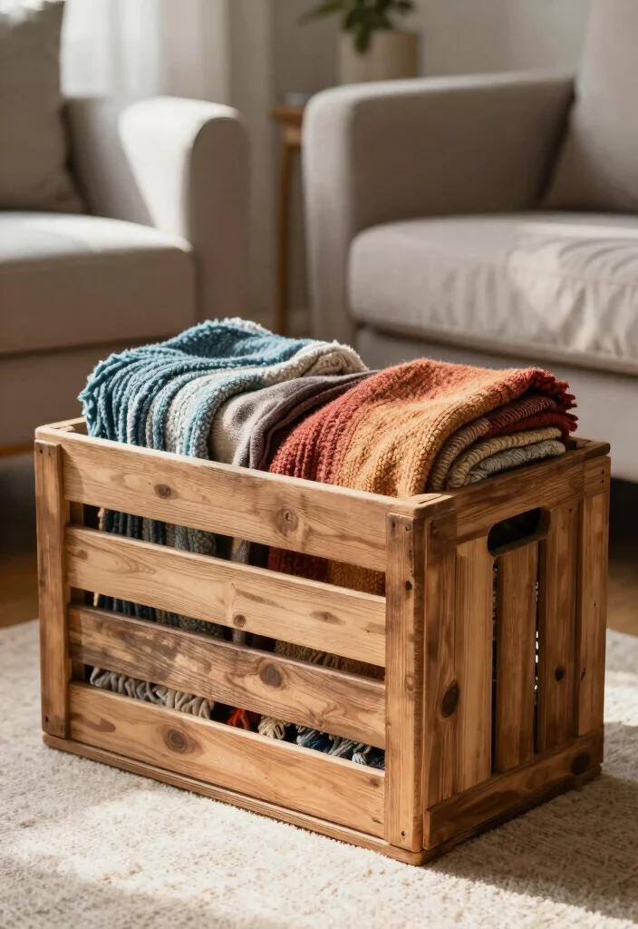 Incorporate rustic wooden crates for a charming, multifunctional storage option that complements any home style.