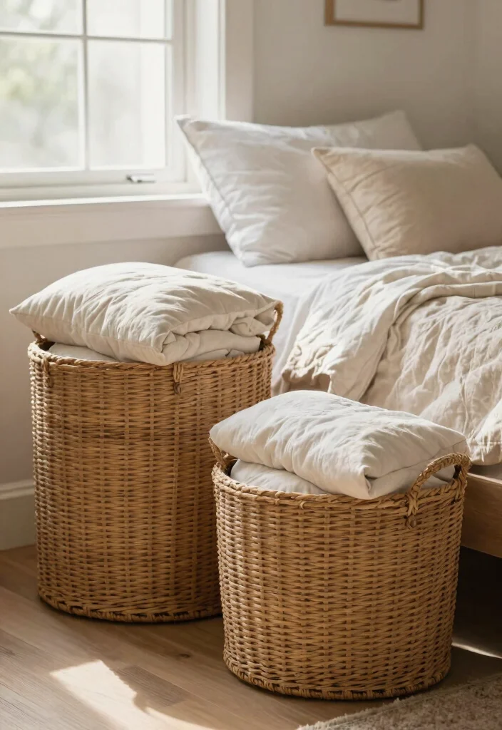 Perfect for storing linens, toys, or bath items, rattan baskets can be paired with soft fabrics and warm colors to enhance their elegance. Consider varying sizes to create an appealing layered look in your space.