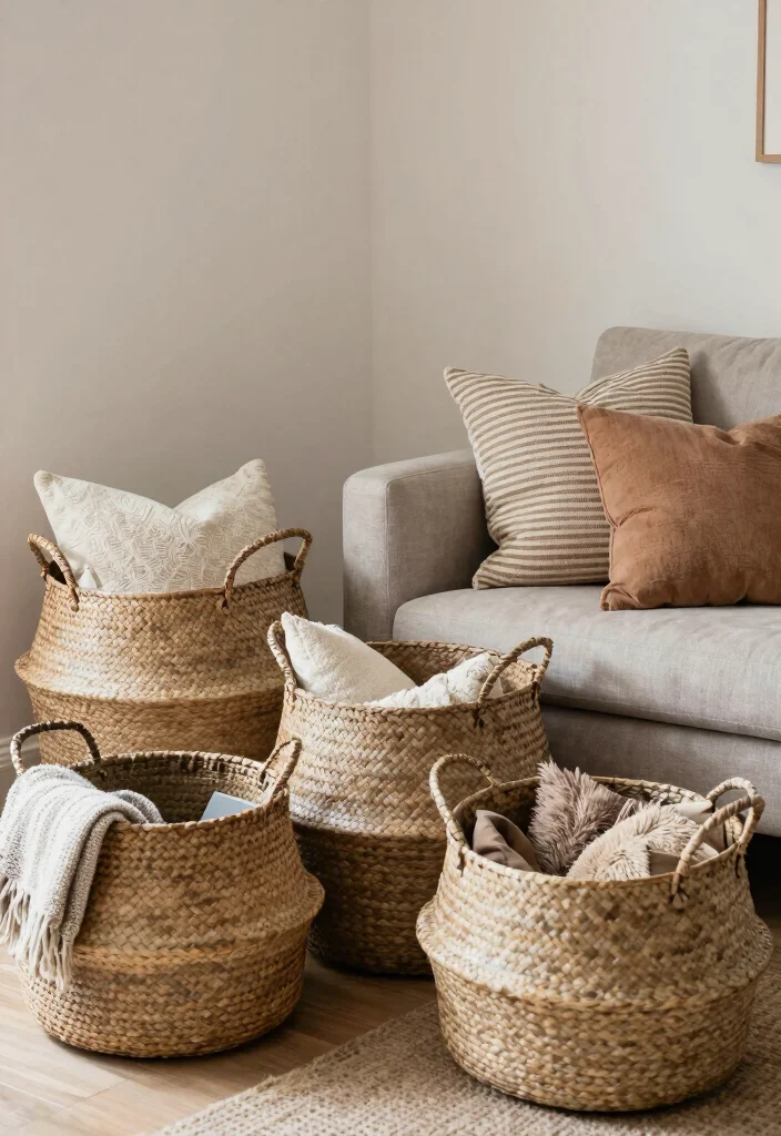 Did you know woven seagrass baskets save space and vibes? They’re a stylish, eco-friendly choice for storage baskets with lids, keeping magazines and throws neatly tucked away. Pro tip: mix sizes for dimension and group a large basket with smaller ones for instant organization.