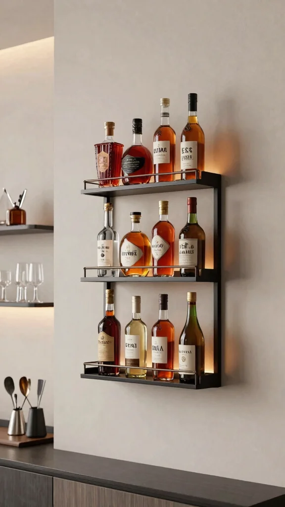 For a sleek and modern look, think about a wall-mounted bar cart.