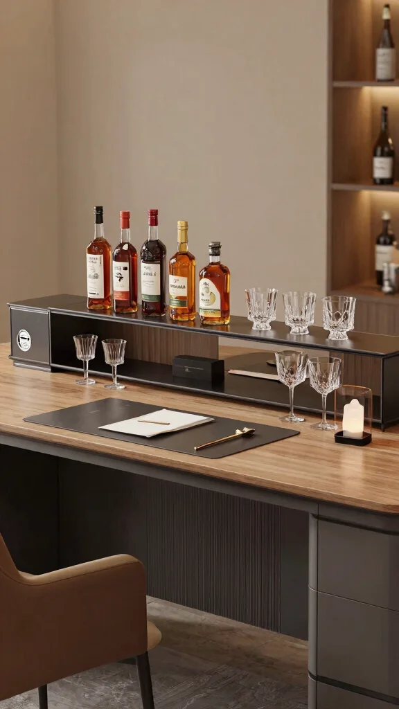 This option is ideal for small spaces, maximizing utility without compromising style. Choose a sleek desk design with built-in storage for your bar essentials. When entertaining, simply arrange your bottles and glasses on the desk, creating a seamless transition from work to play.