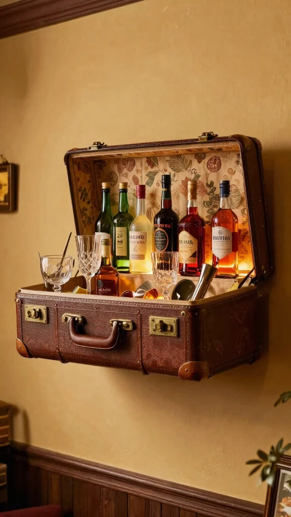 Transform an old suitcase into a charming portable wall bar for a whimsical touch.