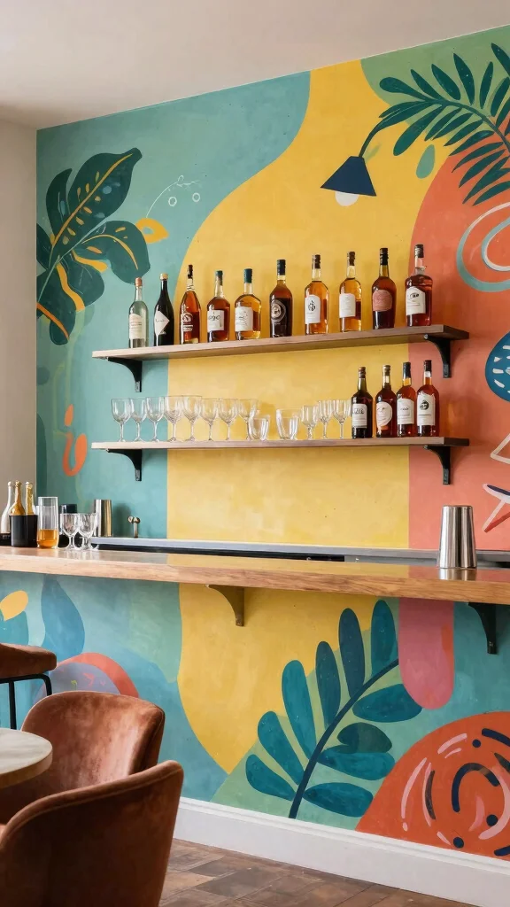 Elevate your wall bar with a vibrant mural that serves as a stunning backdrop.