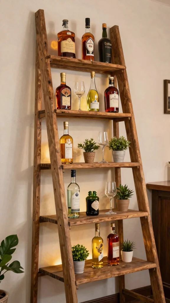 Repurpose an old wooden ladder into a charming bar display that adds rustic appeal.