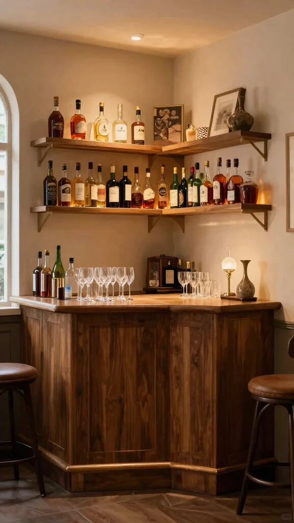 This clever idea maximizes space while adding character to otherwise empty areas. Install shelves or corner cabinets to hold your favorite spirits and barware, making it easily accessible for entertaining. To enhance the nook, consider adding seating or a welcoming rug.