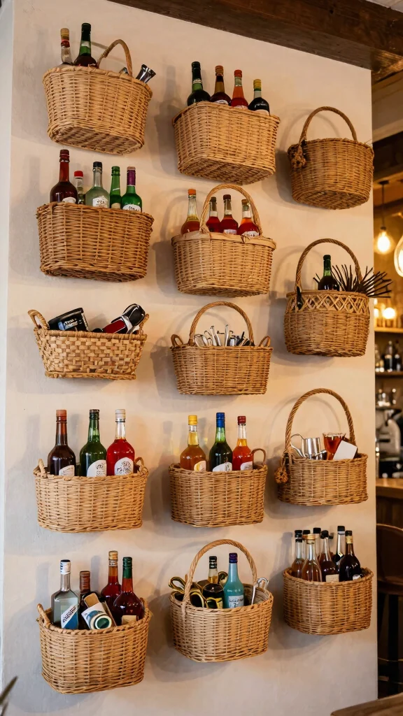 This approach brings texture to your space while keeping everything organized. Hang baskets on your wall or place them on shelves to display drinks and accessories beautifully. With various sizes and colors available, you can mix and match for a personalized touch.
