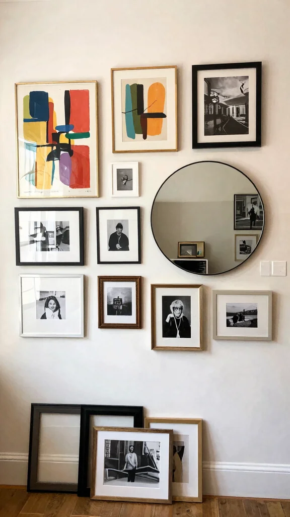 Choose one strong focal piece and layer smaller items around it in a grid or salon-style arrangement to maintain balance.
