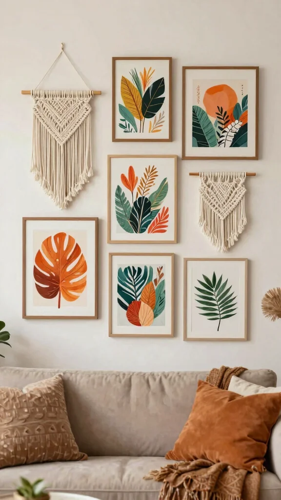 Then layer smaller art prints, textile panels, and natural materials to build depth and texture. Mix earthy tones with pops of color and vary frame shapes for an eclectic look while keeping the palette cohesive.