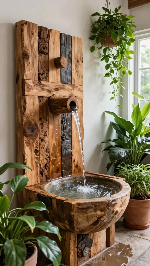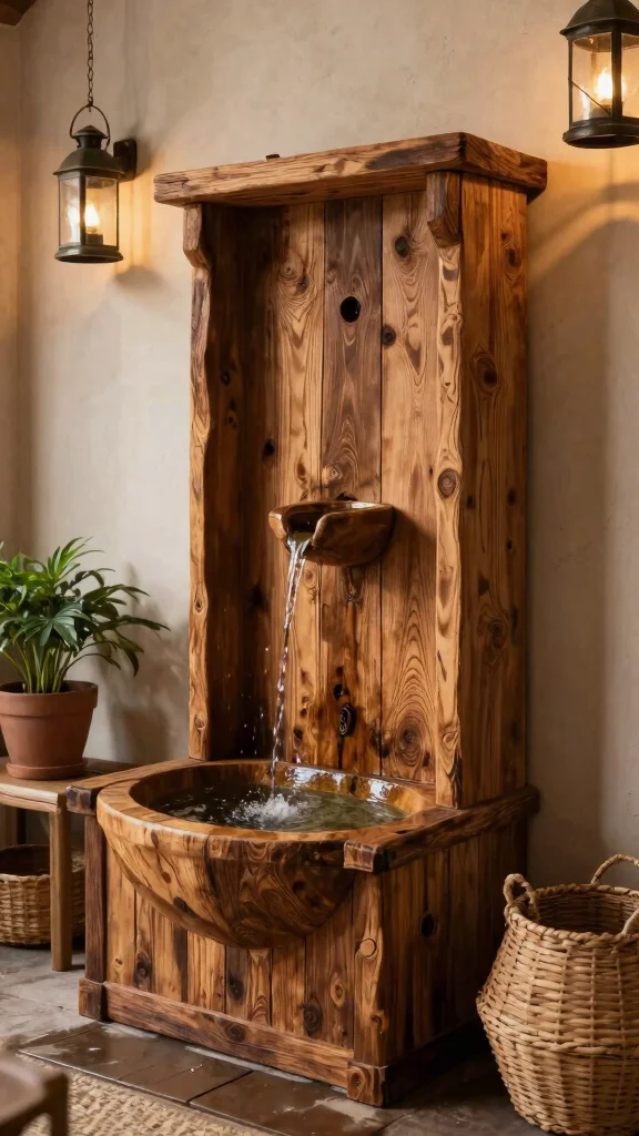 These fountains flourish in smaller spaces, especially when styled with farmhouse or country themes. To protect the wood, seal it against moisture and consider surrounding it with complementary natural materials like jute or wicker. Soft ambient lighting can enhance the wood’s grain and create a warm, inviting glow.