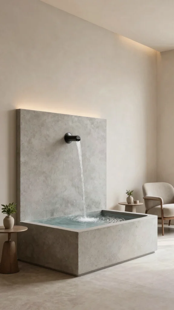 Concrete wall fountains embody modern minimalism, offering a sleek and sophisticated addition to your home. Their clean lines and unpretentious design create a striking visual that enhances contemporary interiors. Imagine a compact concrete fountain in a small living area, serving as a stylish focal point without overwhelming the space. Surround it with monochrome accents or natural wood elements to amplify its minimalist appeal.