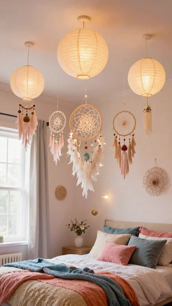 Don’t overlook your ceiling! Adding whimsical decor can provide a unique twist to your bedroom design. Consider hanging lightweight decorations like paper lanterns, dreamcatchers, or mobiles that draw the eye upward, creating a sense of playfulness in your space.