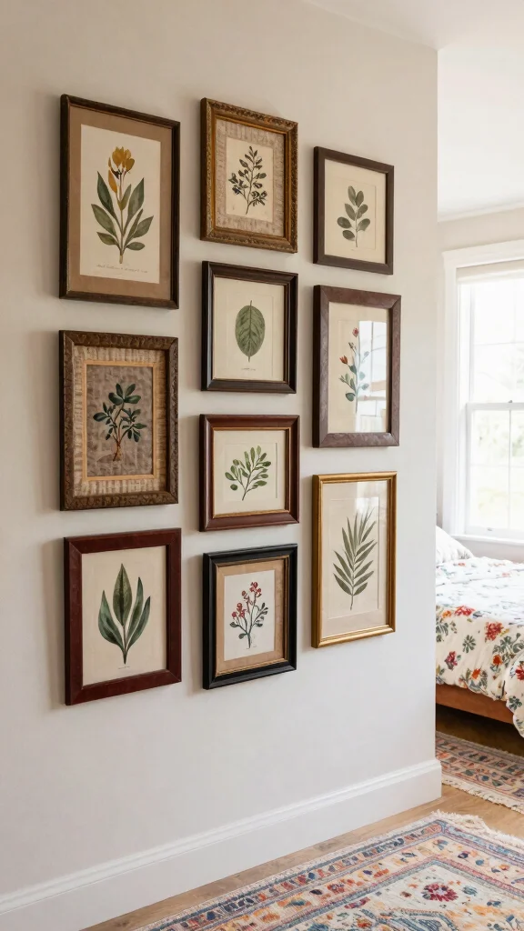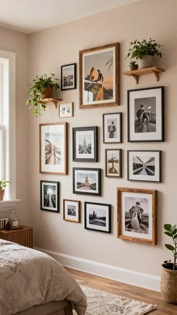 To achieve a harmonious look, select a unifying color scheme that ties your frames together. Adding wall-mounted shelves for small plants or quirky trinkets can elevate the design and enhance its bohemian charm.