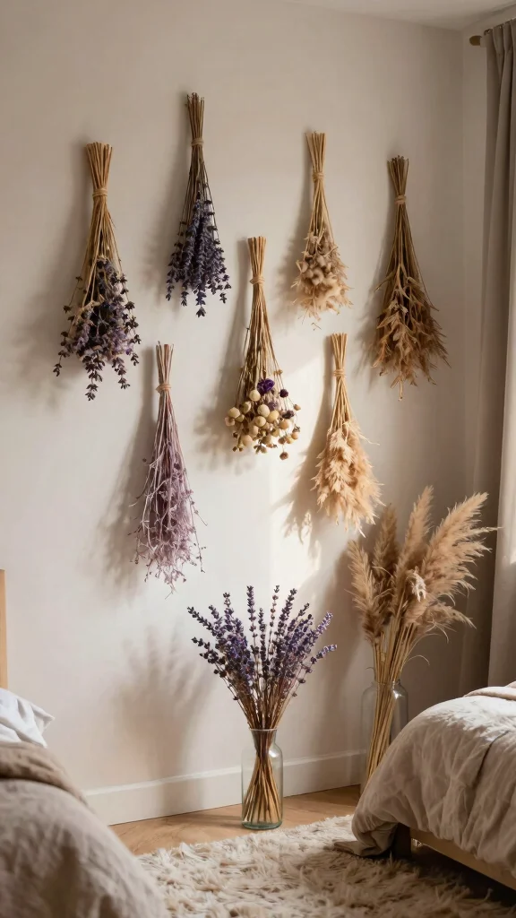Fun fact: dried flower arrangements stay colorfully chic for 6–12 months with minimal care. Pro tip: keep them out of direct sun, and pair lavender with pampas for a breezy bohemian vibe that elevates your wall ideas bedroom.