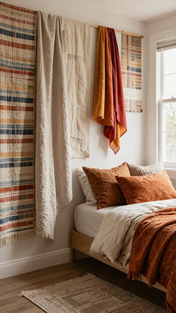 Layering textiles adds warmth and character to your bedroom walls, transforming them into a canvas of coziness. Consider hanging fabric panels, quilts, or even large scarves to create an inviting tapestry effect. This approach showcases a stylish bohemian flair while introducing visual and tactile interest.