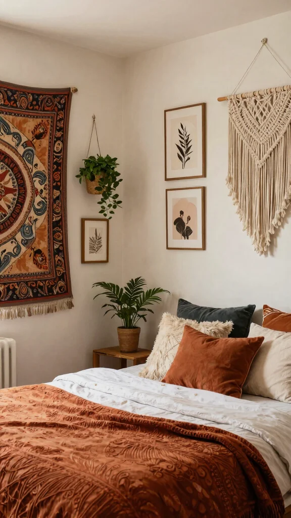 What are budget-friendly bohemian wall decor ideas for a bedroom?
