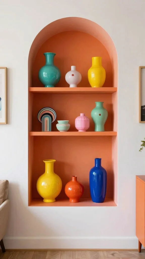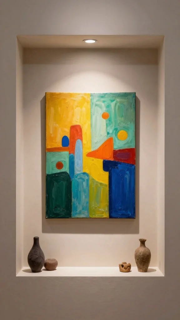 Infuse your home with energy and vibrancy through a colorful accent niche. Using bold hues can transform a simple alcove into a lively statement piece that energizes your space. Select a vibrant color for the background or for the decor items within the niche to create a striking focal point.
