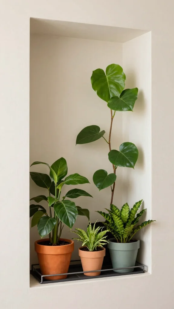 For those who cherish greenery, a built-in planter niche seamlessly integrates nature into your home’s decor. This design allows you to create a mini garden right on your wall, showcasing an array of indoor plants that breathe life into your space. By selecting various-sized pots and mixing in both lush greenery and vibrant flowering plants, you can create a visually appealing display that enlivens your room.