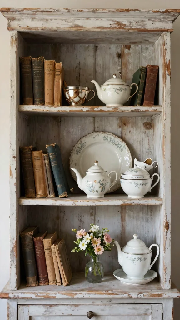 Embrace the rustic elegance of a vintage farmhouse decor niche that tells a story through its curated items. This design invites charm into your home by showcasing antique books, vintage kitchenware, and nostalgic knick-knacks. Pair these treasures with a backdrop of distressed wood to enhance the overall farmhouse aesthetic, creating a warm and inviting atmosphere.