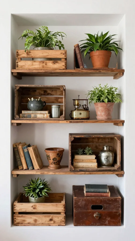 Repurposed materials add character to your wall niche ideas—start small with a vintage crate shelf and a few plants. Swap in pallets or boxes as shelves, and your space tells its own story.