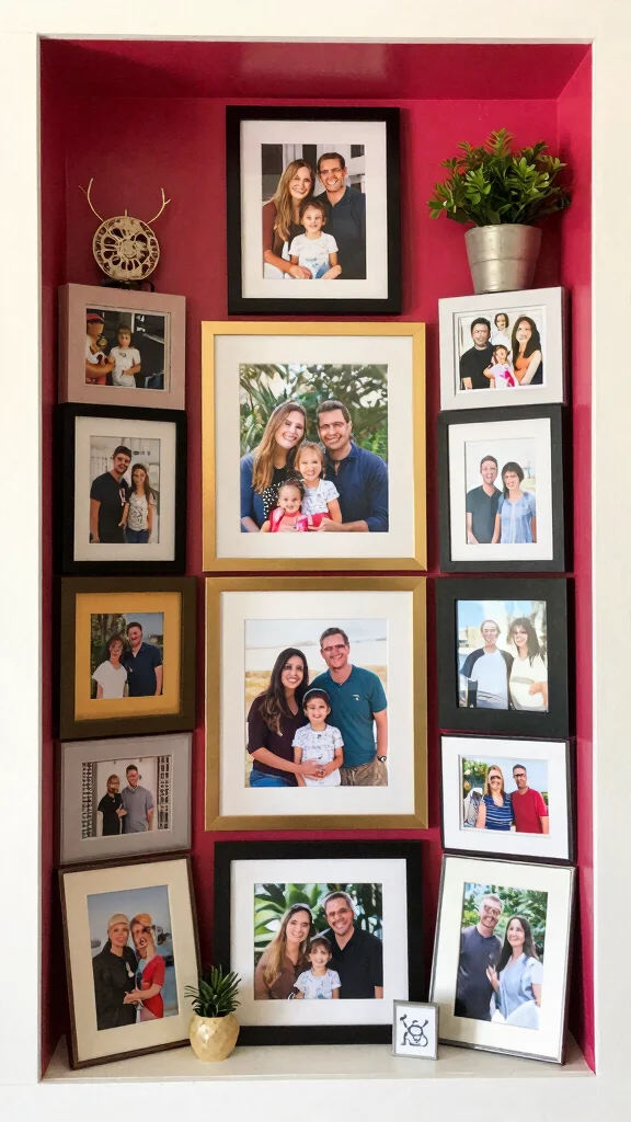 Enhance the display with decorative elements like small plants or meaningful trinkets, personalizing the niche to reflect your family’s story. Consider painting the back of the niche in a bold color to make your photos stand out even more, creating a vibrant backdrop for your memories.